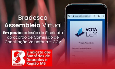 Funcionárias e funcionários do Banco Bradesco, Bradesco Financiamentos, BBI e Bradescard realizam Assembleia virtual nesta quinta-feira, 18 de setembro, das 7h às 19h. Em pauta, está a aprovação da adesão do Sindicato ao Acordo Coletivo de Trabalho para estabelecer as condições de criação e funcionamento da Comissão de Conciliação Voluntária (CCV). O Sindicato indica a aprovação do acordo.