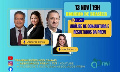 O encontro virtual será transmitido ao vivo, às 19h (horário de Brasília), pelos canais do Associados Previ no YouTube, Facebook e Instagram, além de contar com transmissão simultânea pela TVT, também via YouTube.