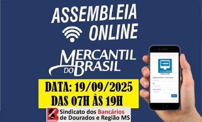 O Sindicato dos Bancários e Trabalhadores do Ramo Financeiro de Dourados e Região MS CONVOCA todos os empregados do Banco Mercantil do Brasil S/A, sócios e não sócios para Assembleia específica/virtual a ser realizada das 07h às 19h do dia 19 de setembro de 2025, na forma disposta no site www.bancariosms.com.br onde estarão disponíveis todas as informações necessárias para a deliberação acerca da proposta negociada, conforme Edital e acordos abaixo: