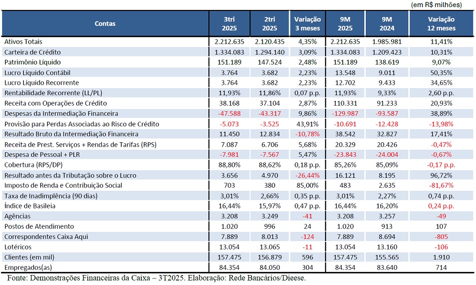A Caixa segue registrando lucros elevados ao longo de 2025. Apenas a título de comparação, grandes bancos privados, como Itaú, Bradesco e Santander, tiveram resultado moderado no 3º trimestre, inferior ao salto observado pela Caixa no período.