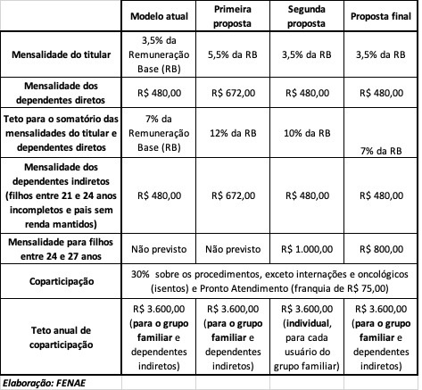 Confira abaixo a tabela comparativa das propostas apresentadas pela Caixa para a custeio do plano, e as respostas às dúvidas mais frequentes: