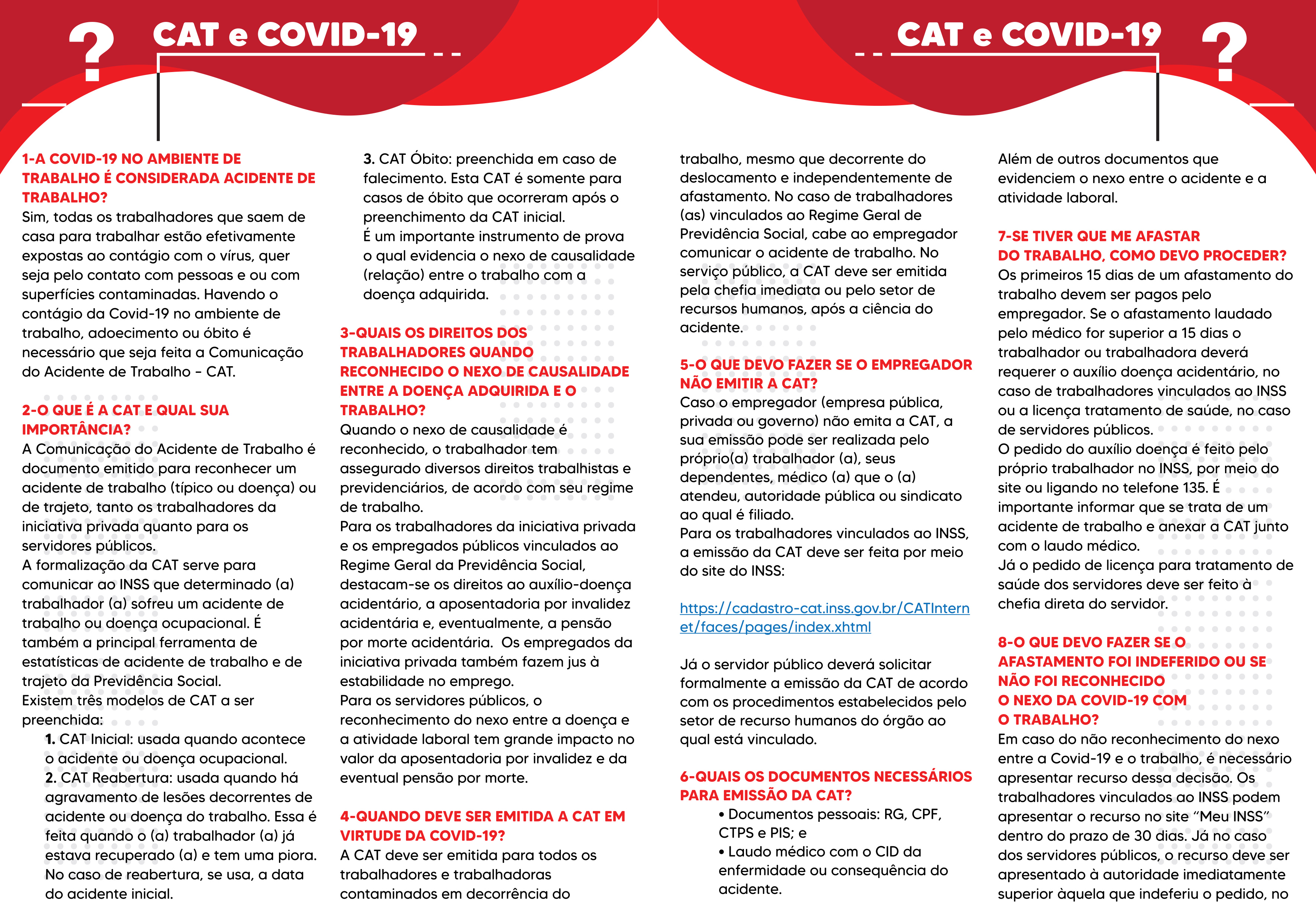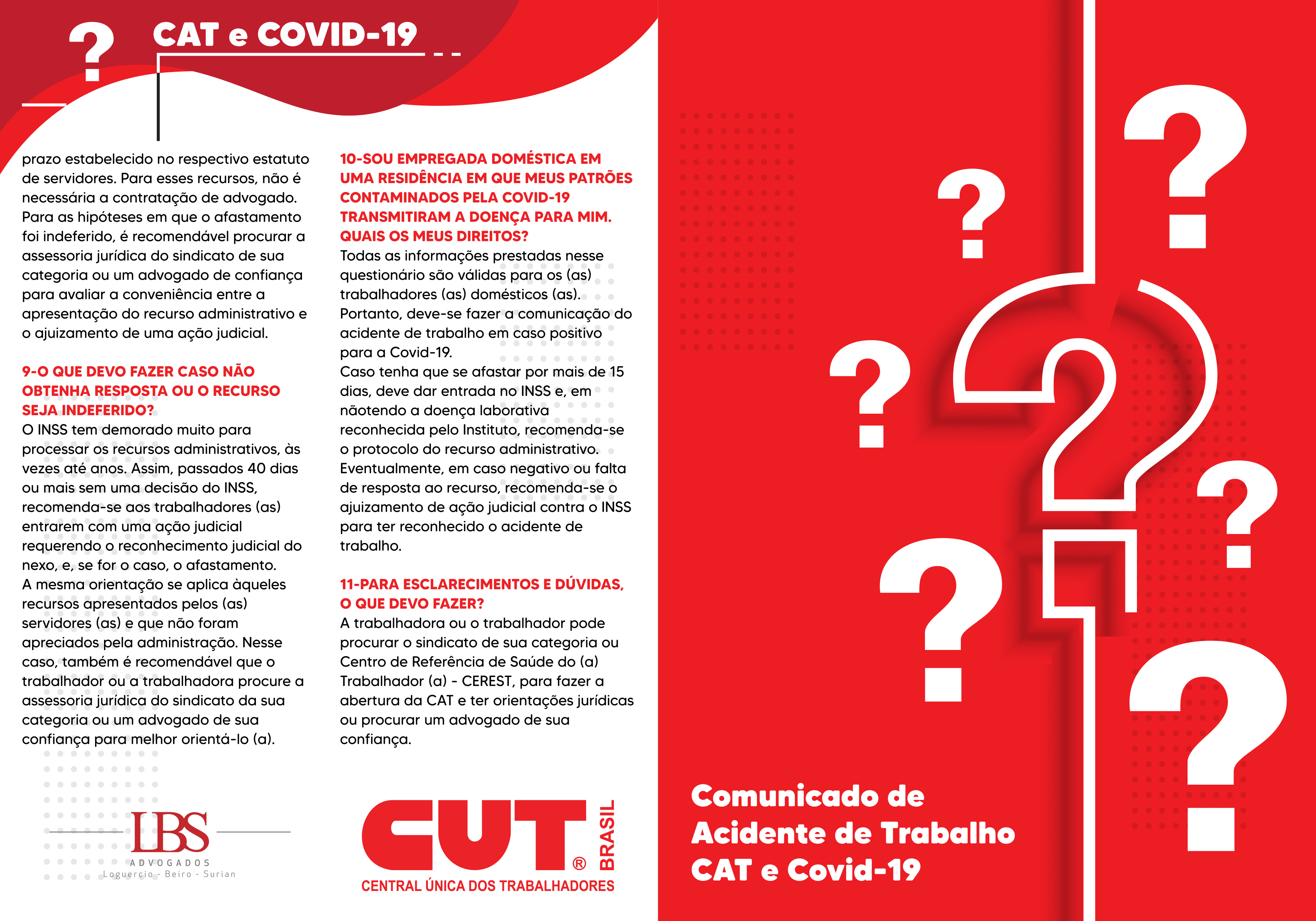 Neste sentido, buscando potencializar a ação sindical na emissão dos Comunicados de Acidentes de Trabalho – CAT relacionado a covid-19, a Secretaria de Nacional Saúde do(a) Trabalhador(a) da CUT e a LBS Advogados, elaboraram um folheto com perguntas e respostas, para que os trabalhadores tenha em mãos como se orientar sobre a emissão da CAT e principalmente a importância de fazê-la.