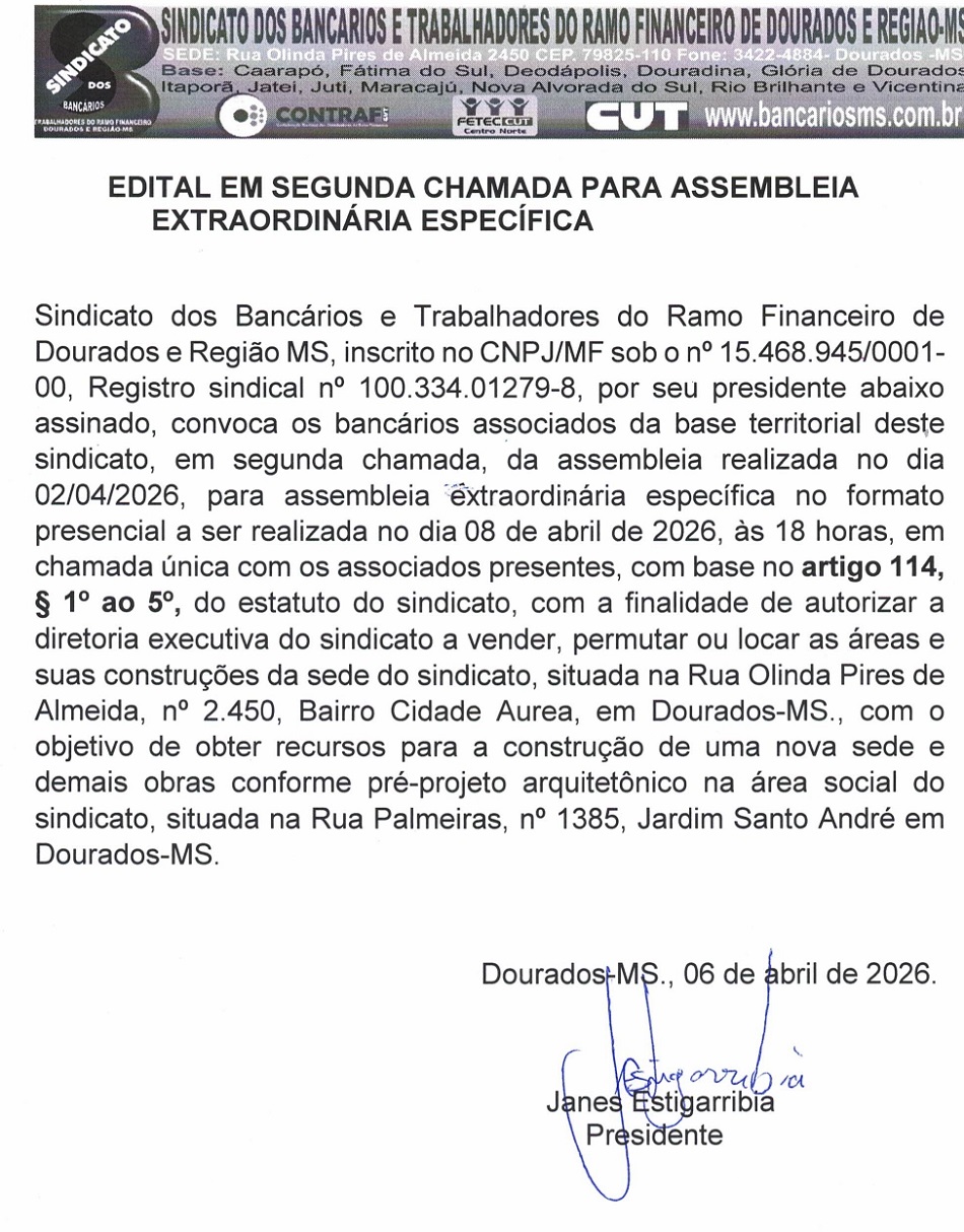 Sindicato convoca seus associados, em segunda chamada, da assembleia realizada no dia 02/04/2026, pra assembleia extraordinária específica a ser realizada na sede da entidade no dia 08 de abril de 2026, às 18 horas, com base no artigo 114, § 1º ao 8º, do estatuto do sindicato, conforme Edital de Convocação abaixo: