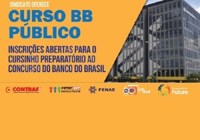 Estão abertas as inscrições para o “Curso BB Público”, preparatório para o concurso público do Banco do Brasil. Aberto à comunidade, o curso é uma iniciativa do Sindicato dos Bancários de Brasília em parceria com a Fetec-CUT/CN (Federação dos Trabalhadores em Empresas de Crédito do Centro Norte), a Fenae (Federação Nacional das Associações do Pessoal da Caixa Econômica Federal) e a Contraf-CUT (Confederação Nacional dos Trabalhadores do Ramo Financeiro).