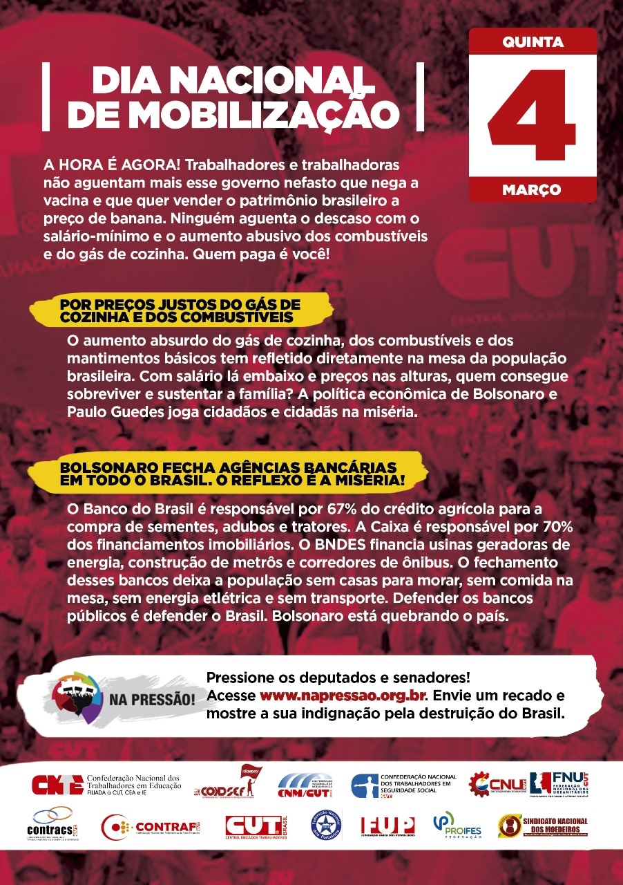 Uma das motivações da mobilização são os planos do governo de fechar agências bancárias em todo o país e demitir 5 mil funcionários do Banco do Brasil. O presidente que nada faz diante da pandemia também quer desmontar a Caixa. A mobilização foi unificada com ações da categoria bancária, trabalhadores da Petrobras e dos Correios. Além da ameaça de privatização das empresas públicas, os atos são contra a política de preços dos combustíveis, por preços justos do gás de cozinha e dos combustíveis.