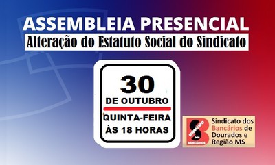 O Sindicato dos Bancários e Trabalhadores do Ramo Financeiro de Dourados e Região MS CONVOCA todos os empregados sócios da base territorial deste sindicato para participarem de Assembleia Geral Extraordinária que se realizará de forma presencial, nesta quinta-feira, 30 de outubro da 2025, às 17:30 horas em primeira convocação e às 18:00 horas em segunda convocação, para discutir e deliberar sobre a seguinte PAUTA: