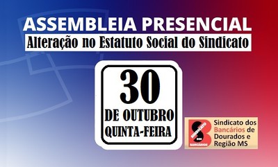 O Sindicato dos Bancários e Trabalhadores do Ramo Financeiro de Dourados e Região MS CONVOCA todos os empregados sócios da base territorial deste sindicato para participarem de Assembleia Geral Extraordinária que se realizará de forma presencial no dia 30 de outubro de 2025, às 17:30 horas em primeira convocação e às 18:00 horas em segunda convocação, para discutir e deliberar sobre a seguinte PAUTA: