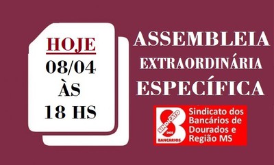 O Sindicato dos Bancários e Trabalhadores do Ramo Financeiro de Dourados e Região/MS convoca seus associados, em segunda chamada, da assembleia realizada no dia 02/04/2026, para assembleia extraordinária específica a ser realizada na sede da entidade nesta quarta-feira, dia 08 de abril de 2026, às 18 horas, com base no artigo 114, § 1º ao 8º, do estatuto do sindicato, conforme Edital de Convocação abaixo: