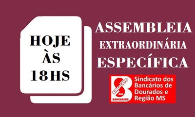 O Sindicato dos Bancários e Trabalhadores do Ramo Financeiro de Dourados e Região/MS, CONVOCA seus associados para uma Assembleia Extraordinária específica que será realizada nesta quinta-feira, dia 02 de abril de 2026, às 18 horas, na sede da entidade em Dourados, sito a Rua Olinda Pires de Almeida, 2450, no Bairro Cidade Áurea, quando estará em discussão e deliberação, autorização a diretoria a vender, permutar ou locar a área da sede do sindicato, conforme objetivos descritos no edital de convocação abaixo: